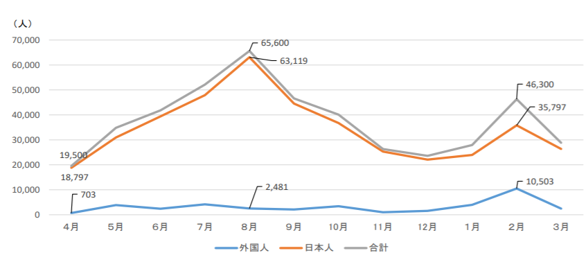 According to the Abashiri Government report, the number of tourists in Abashiri peaks in August (Hokkaido is much cooler in summer so many Japanese retreat from the oppressive summer heat further south) and then a smaller peak in February for the sea ice (where more foreigners arrive – the blue line below). Going to Hokkaido in the summer isn’t so much of a draw for those outside of Japan as Hokkaido is less convenient to travel and less foreigner friendly (in terms of English)