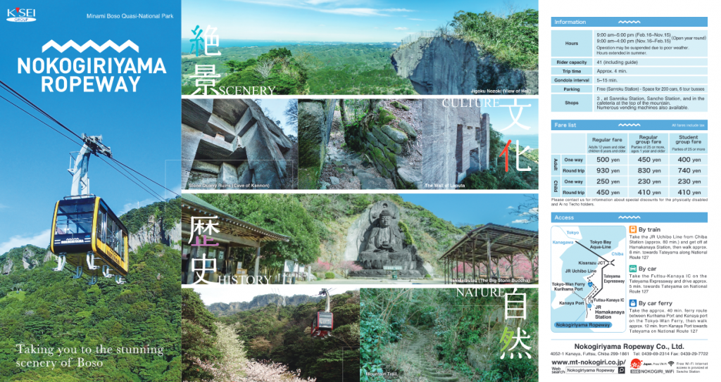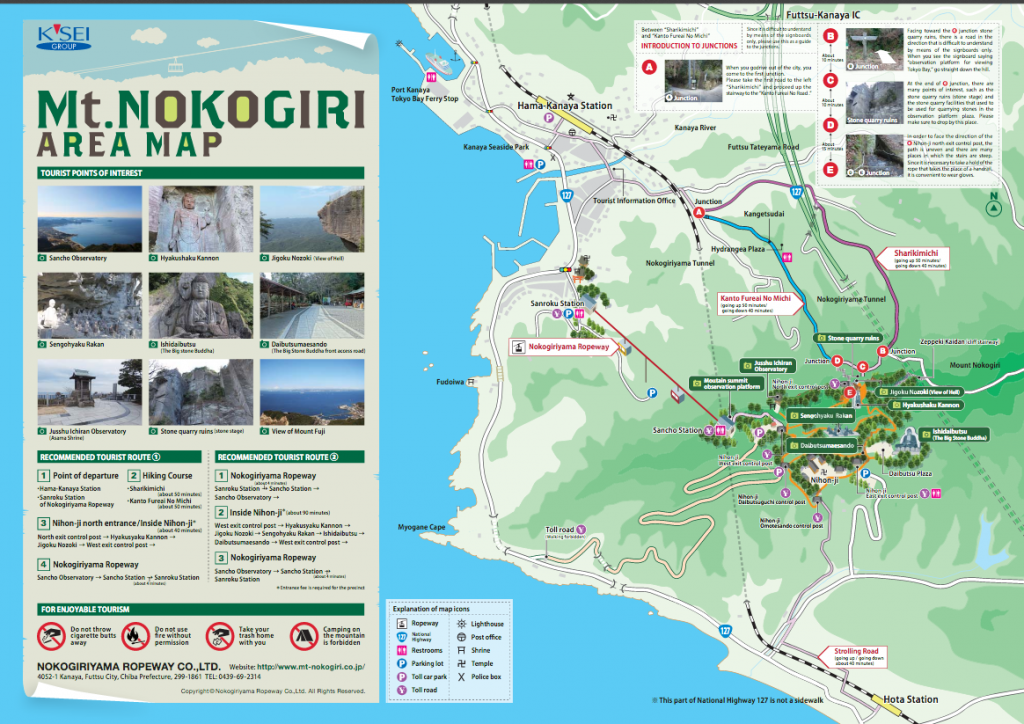 Buzz-Saw mountain is about 2.5 hours away from major Tokyo stations by bus or regular train. There are two stations nearby, Hama-Kanaya Station and Hota Station. Hama-Kanaya is the main station close to a few restaurants and the ropeway to the mountain summit. Hota Station is a local, rural station that is closest to the foot of the temple complex should you want to walk down rather than take the ropeway. Both stations are served by the same trains so either can be used.
