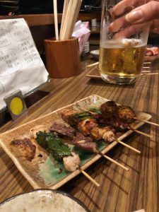 Skewered Chicken, seasoned with salt or with a sweet "tare" sauce, is a favorite evening meal co-workers or friends share...