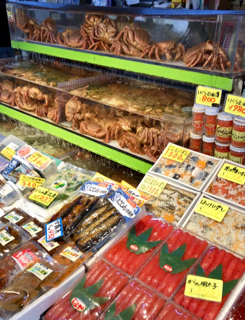 The seafood market in all the guide books is famous for crabs and other live seafood, and there are plenty of restaurants in and around the market that prepare fresh dishes from the market goods. If you live in Japan you can have the market staff pack up and send your crabs back home, although if you are a tourist probably best to eat one there and then.