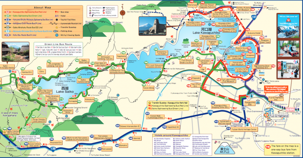 You can take buses around the lake and to and from the major tourist attractions in Lake Saiko and the Ice and Wind Caves. See details on this site. Below is a map part of the network. There is more information on the “Green Line” bus in the Lake Saiko article.
