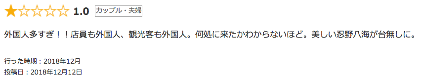 Reading down the 1 star reviews of Oshino Hakkai on the popular Japanese hotel booking website Jalan, a common theme of “stupid numbers of foreign tourists” stands out. Here is a pretty representative review.