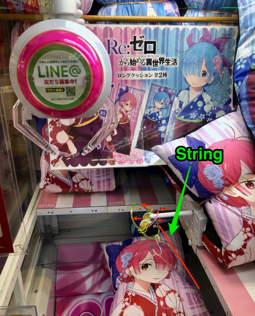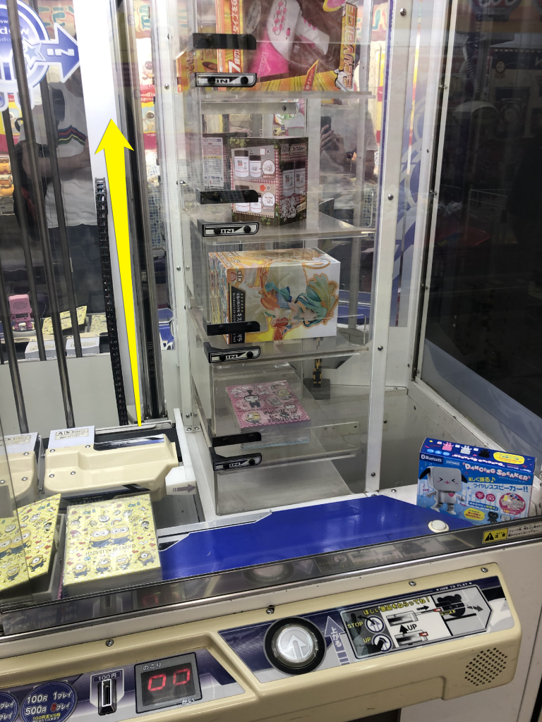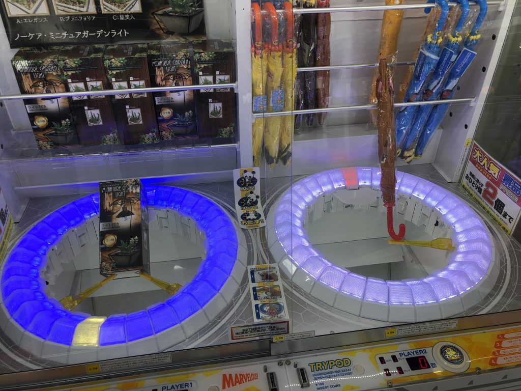 There are plenty of variations on this theme, such as rod into holes, keys into locks, etc. As with the “string cutting” game, the first dimension of movement is a freebie that is guaranteed or as close as. The second dimension will not allow you to hit the target until the machine has past the profit setting. The hand or rod will slip past the target most times regardless of how accurately you release the button to stop it. However, it is a good way to spend ¥100 as sometimes you can get it first go if the machine hasn’t payed out for a long time.
