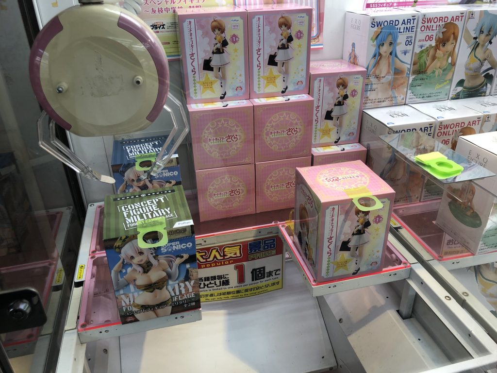 In the SEGA game centers particularly, the classic “UFO Catcher” games are often stacked machines deep, filled with the latest anime figures for both boys and girls (usually boys of course). One section of the game center will have all the action anime like “Dragon Ball Z” and “One Piece”, and in another section will be all the big-breasted, scantily clothed, barely legal, semi-porn figures of late night anime. The method to obtain the prize is mostly the same and does not involve “grabbing” the prize with the pincers.