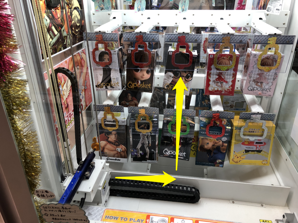 A variation is the boxes facing forward rather than to the side. You still have to pull the box however it will twist round. If the prize is in the center, then you will have to alternate the pincer arms to nudge the prize forward little by little. Just twisting a center box round one way will only move it into a position too far left or right where the pincers cannot go – game over, call an attendant and apologize for being such a newbie.
