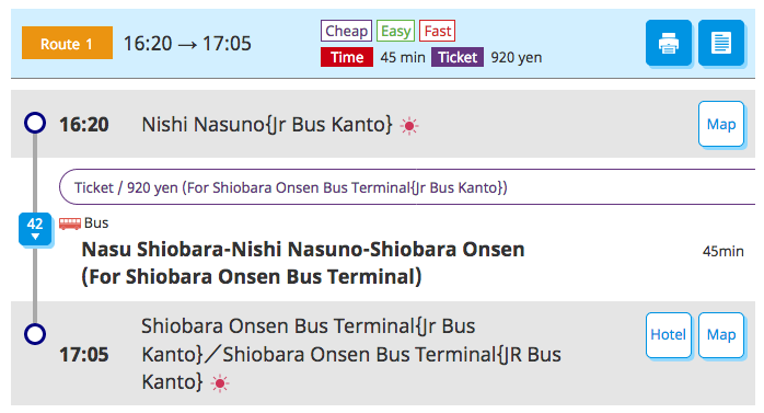 Buses are far more frequent from the nearby station, Nishi-nasuno. This station isn’t serviced by the Shinkansen. However, you can get there easily from Ustunomiya Station by regular train and it only takes an extra 10 minutes. Buses are far more frequent (and slightly cheaper as less distance).