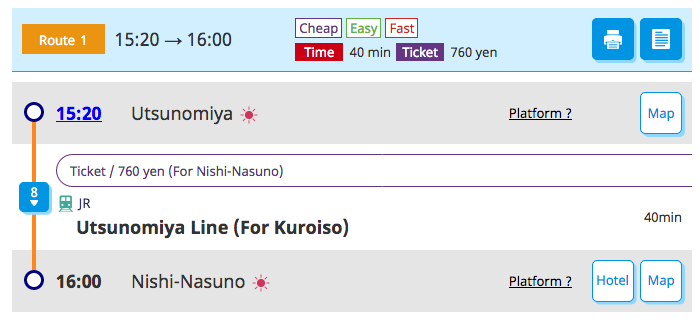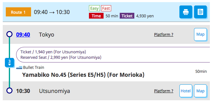 1) Train from Tokyo to Utsunomiya Station (Jorudan Link).
