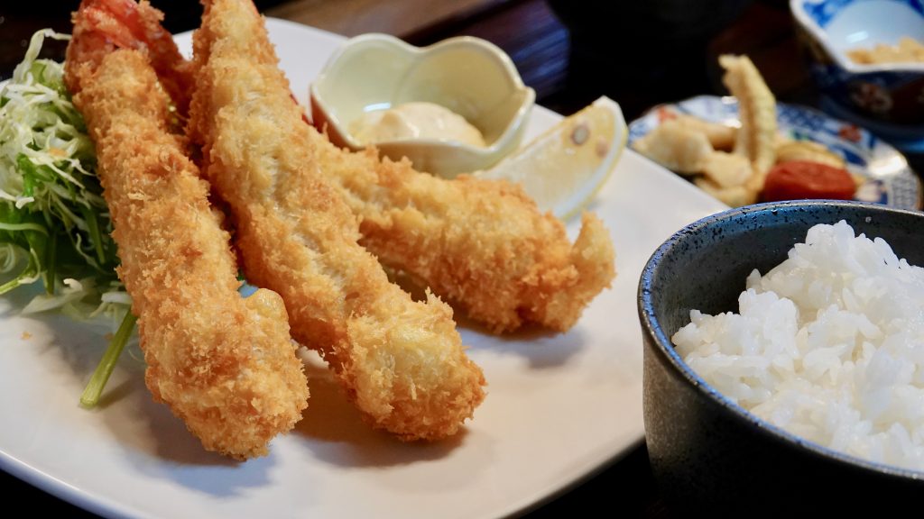 Shrimp served in the Tonkatsu style (3 or 4 shrimp is usual)