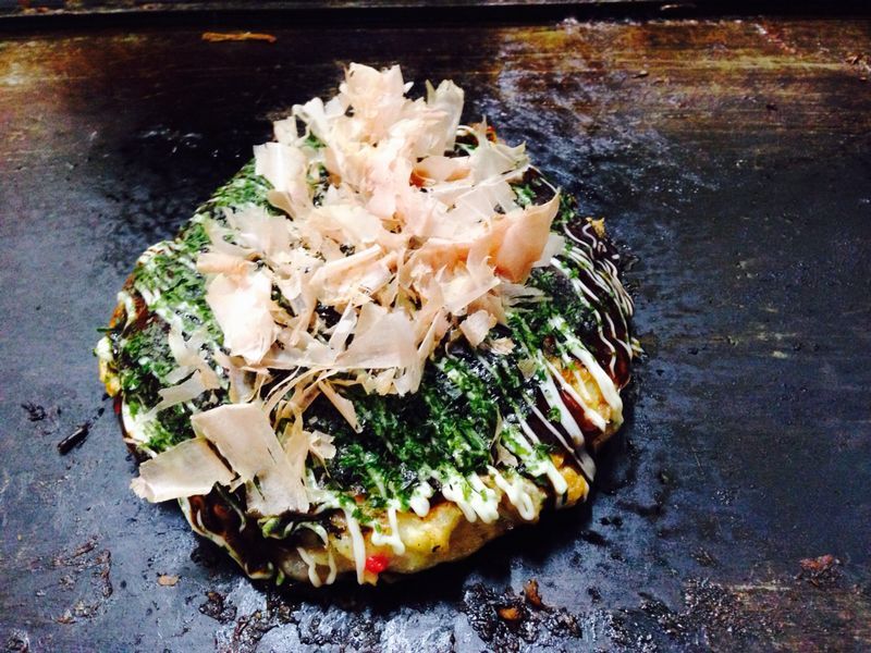 • Start with an okonomi-yaki, one per two people. Recommended fillings are beef, octopus, Italian (pizza, basically), kimchi (Korean pickled cabbage), and of course absolutely anything plus cheese.
